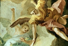 Himmelsszene, der Erzengel Michael schleudert Blitze gegen