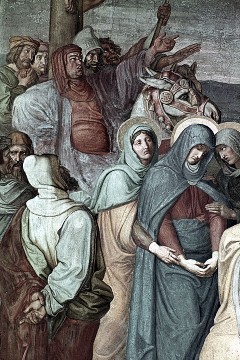Ausschnitt links: Trauergruppe um Maria und Hohepriester mit